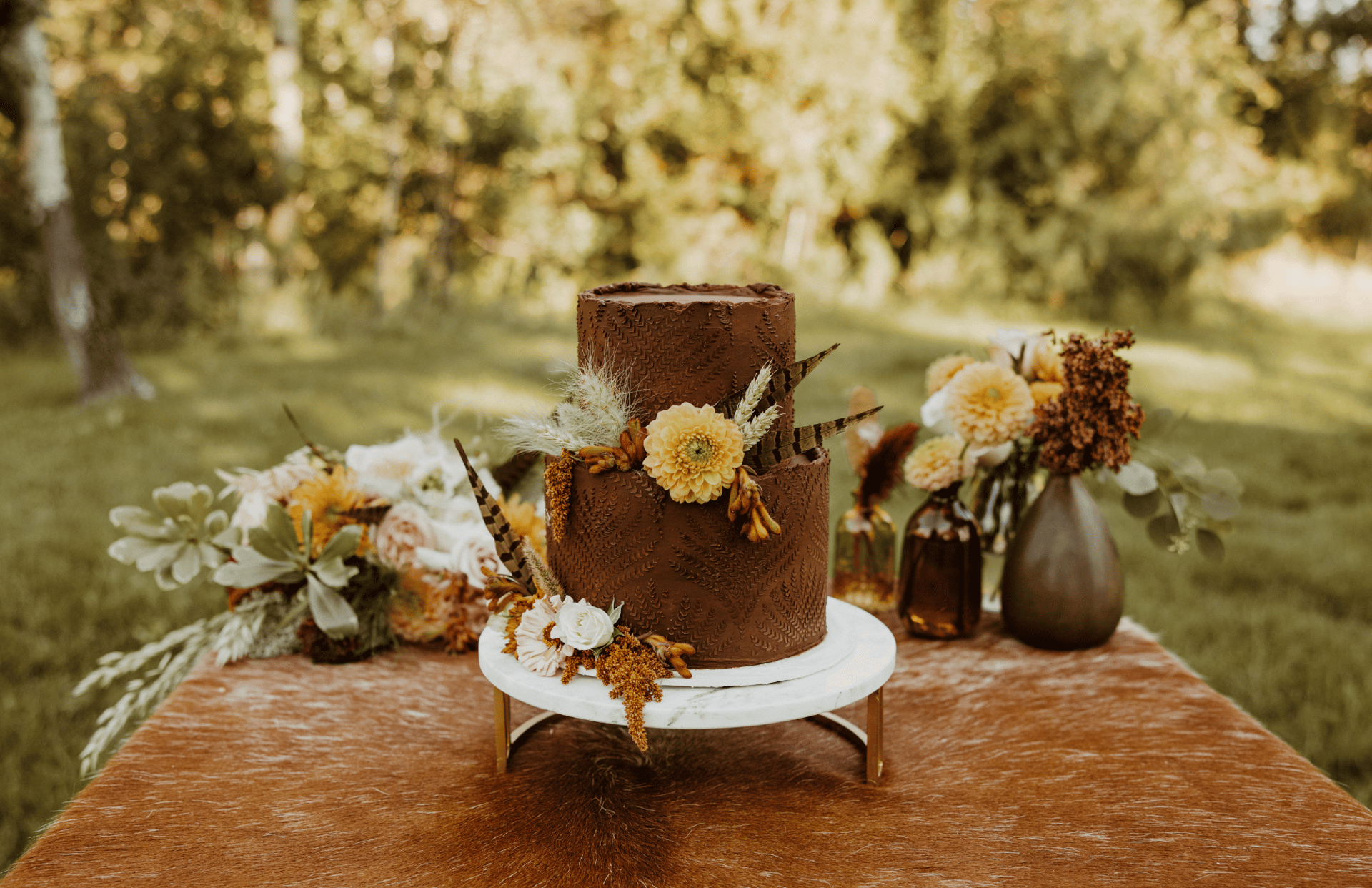 Another thing to consider when choosing the location for your dessert table is that your wedding cake should not sit in direct sunlight for any length of time. Most wedding cakes are constructed and finished with buttercream frosting, and they often have fondant or sugar decorations or delicate buttercream textures. The heat from direct sunlight will soften frosting, fondant, and sugar decor quite quickly, leading to the cake being more easily damaged. Decorations can melt and be ruined, and the cake can become unstable and more likely to lean or fall over. So, wherever you decide to display your cake (whether inside or outside), make sure to find a shady place where it can be protected from sun damage.