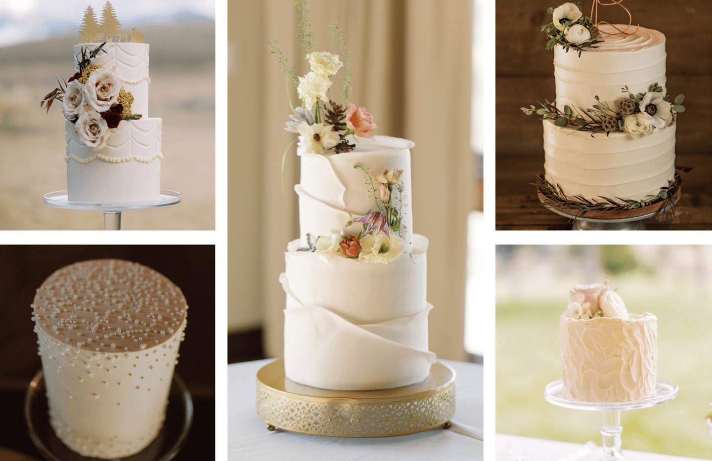 While these cakes have a simple white-on-white color scheme, the design is anything but basic. Adding white flowers to a cake finished with white buttercream frosting is a classic and timeless design that will always be stunning and stand the test of time. White buttercream flowers can be textured into the frosting to add dimension, fresh flowers can be arranged on the cake, or hand-crafted sugar flowers can be added for a special touch. All of these options result in a beautiful wedding cake design that will never go out of style.