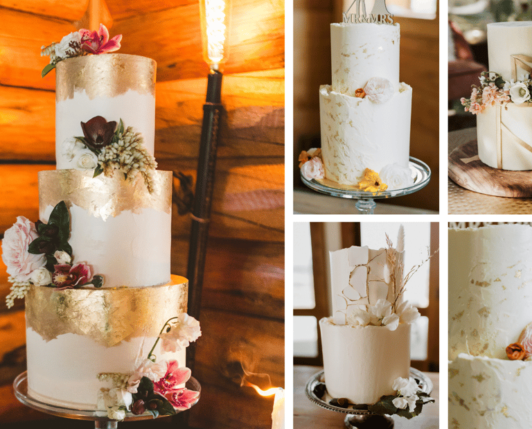 If you are looking for a classic cake design with a twist, consider adding gold details to your wedding cake. Gold foil can be applied to the top of each cake tier for a clean, modern look, or flecks of gold can be swirled into white buttercream frosting for a special, whimsical touch. Gold can also be painted onto the cake to highlight special features or textures and bring the cake to life. White and gold is a classic combination that can be as bold or simple as you would like it to be, and adding a touch of gold is an easy way to add a glamorous element to your cake design.