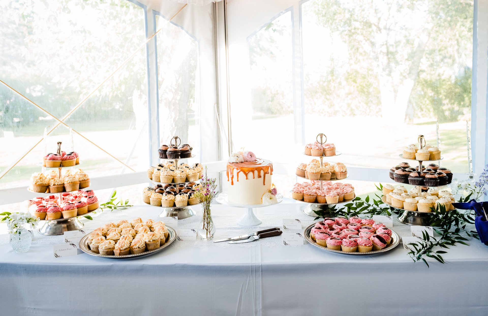 If you like a really clean look for the dessert table, you can definitely skip this step, but we love how adding some flowers or greenery to the dessert table ties the decor in with the rest of the wedding! Ask your florist to bring some extra flowers and greenery that can be used alongside the dessert bar to bring the table to life. Place larger boughs of greenery under and around stands and platters to add a splash of color and a boho feel, or include a large bouquet as the centerpiece of the dessert table instead of ordering a cake. However you choose to use them, adding flowers and greenery to your wedding cake will make it feel fresh and vibrant, and will blend with the rest of the wedding design!