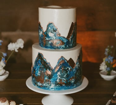 A perfect blend of rustic and elevated elegance, this stunning tiered wedding cake showcases a bold mountain design. The perfectly smooth white buttercream base adds a classic touch to the design, while dramatic mountains painted in deep blue and copper colors steal the show. The rich colors incorporated into the mountain design add warmth and visual interest, making this cake perfect for a seasonal wedding. This gorgeous design works especially well for a reception in a mountain setting, or any wedding with an elevated, rustic theme.