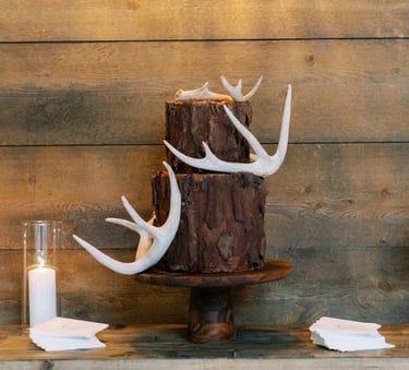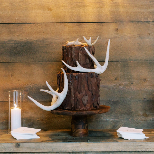 Including a groom’s cake on your dessert table is a great way to ensure that both the bride and groom get exactly what they want! The groom’s cake typically celebrates and highlights a favorite hobby or pastime that the groom is passionate about. This might be golfing or fishing or, in this case, hunting. This small two-tier cake has been finished with chocolate buttercream frosting that has been textured and molded to look like tree bark. Antlers from one of the groom’s hunting trips wrap around the cake, completing the rustic aesthetic. Adding a groom’s cake to your wedding is the perfect space to incorporate fun, personalized designs!