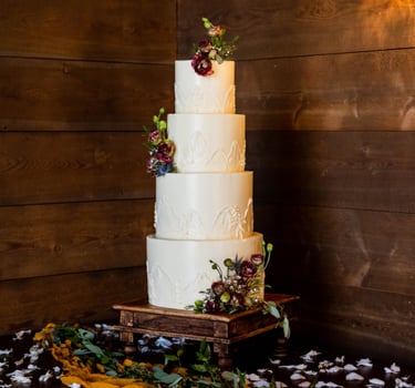 Winter weddings have a charm all their own—crisp air, moody skies, twinkling lights, and that irresistible sense of cozy romance. Your wedding cake can be one of the most beautiful ways to bring the magic of the season to life. A beautifully textured white cake celebrates the season of snow, or playing with darker, moody colors creates a unique design that is perfect for a warm, cozy aesthetic. Whether you’re leaning elegant and timeless or whimsical and seasonal, winter is full of delicious design inspiration.