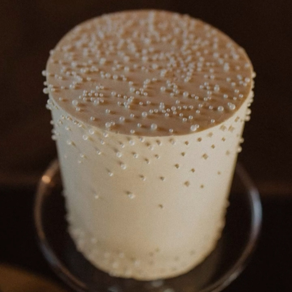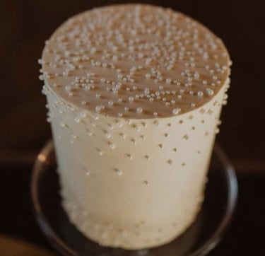 Is there anything more classically elegant than white pearls? This stunning single tier wedding cake celebrates traditional elegance with a smooth white buttercream finish and an artful arrangement of candy pearls. The pearls are concentrated on top of the cake and sprinkle down the sides of the tier, looking like snowflakes gently falling on a snowy landscape. This design is simple but elevated, and is perfect for any wedding with a beautifully traditional aesthetic.