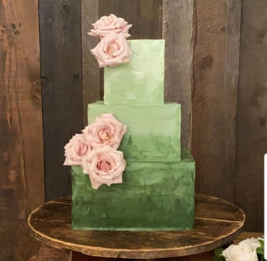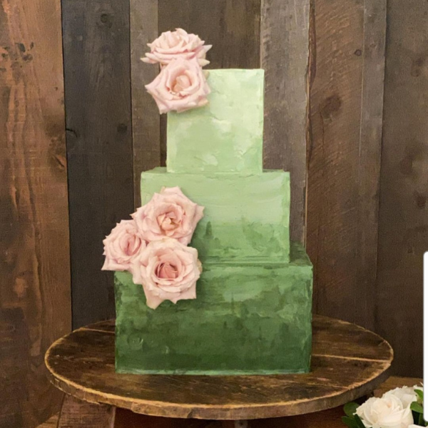 The winter season is the perfect time to think about incorporating darker, bolder colors in your wedding cake design. Deep, vibrant colors make the cake feel rich and warm, perfect for when the weather outside turns cold. This wedding cake showcases unique square tiers, the geometric shape perfectly balancing the soft color gradient of dark green at the bottom to pale green at the top. Subtle texturing adds dimension and visual interest, while simple pink roses give the cake a more traditional twist. This cake design is perfect for any winter wedding that celebrates unique design elements and bold colors.