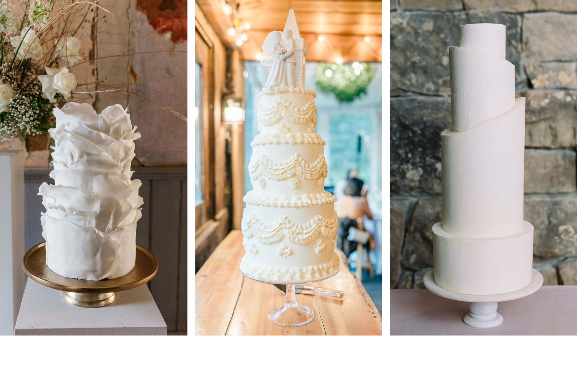 Detailed piping - three-tier cakes are the most classic size for a wedding, so sticking with a really traditional design can be a great way to go. Vintage-inspired Lambeth piping along each tier makes the cake feel timeless, and adding a custom topper can create additional height that grabs the eye and makes a statement on the dessert table. This design is traditional while still feeling modern, and is a great option for any wedding.