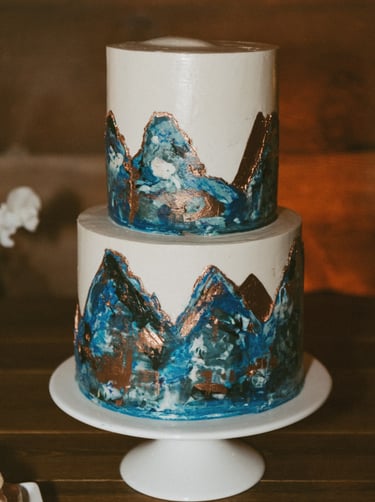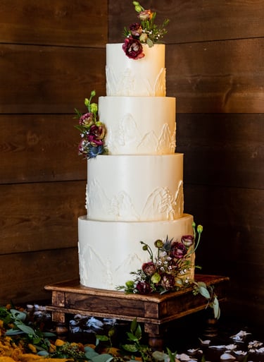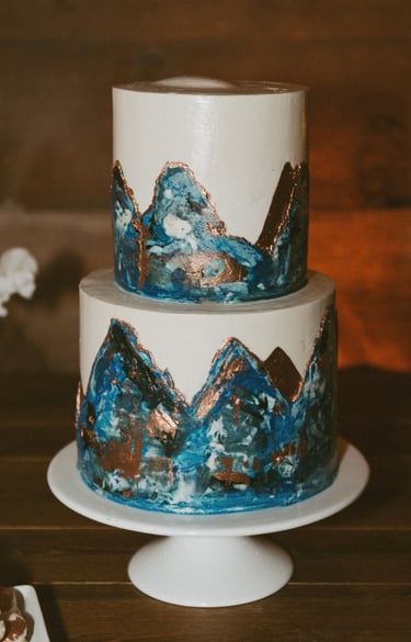 Vivid buttercream images - again, because of the more limited size of two-tier wedding cakes, we love to play with color and visuals by adding detailed buttercream images as the design focus. This could be a fun mountainscape that includes moody tones, a bouquet of buttercream flowers in the wedding colors, or even a piped scene of your favorite hobby, like camping in the woods. There are limitless ways to utilize this design, and each cake feels really unique and memorable.