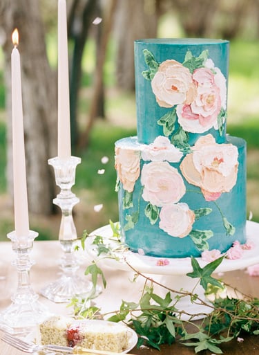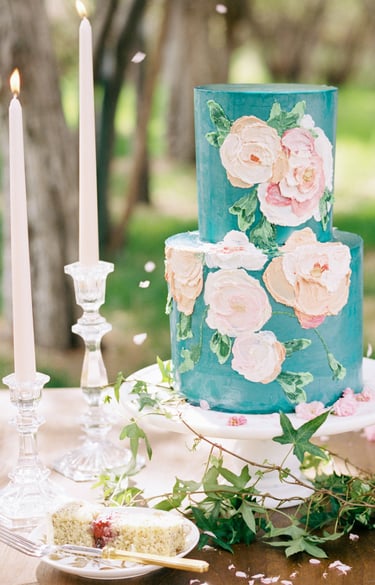 Colorful base frosting - because two-tier cakes are not as large or towering as cakes with three or more tiers, it can be fun to explore brighter colors in their designs, as this helps them stand out. Including a bold color like emerald green or Tiffany blue as the base for the design will make the cake feel unique and have a dramatic presence despite its smaller size.