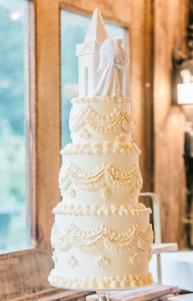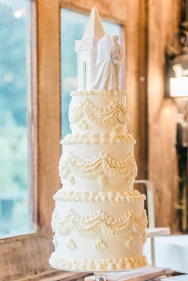Four-tier wedding cakes make a true statement. With added height comes drama, luxury, and a sense of grandeur that’s perfect for larger celebrations. These cakes are perfect for extravagant weddings with high guest counts, formal black-tie weddings, and celebrations that take place in venues with high ceilings or dramatic backdrops.