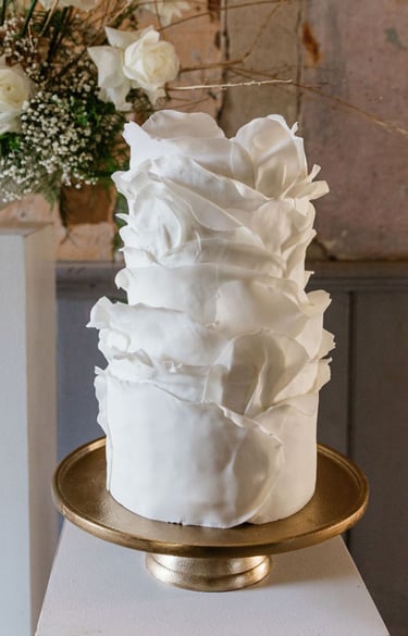 Dramatic textures - if you would like to keep to a monochromatic white color palette on a smaller wedding cake, we recommend adding a bold textured element to give the cake exciting visual interest. For this two-tier cake, we wrapped thin layers of fondant around the cake to create a dramatic ruffled effect. This design catches the eye in a way that feels both contemporary and classic.