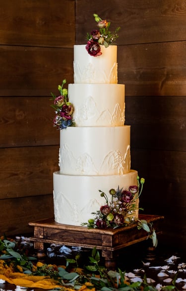 Monochromatic mountains - four-tier cakes give you a lot of space to work with, and creating a mountain landscape along the sides of each tier is a great way to make use of the towering surfaces. Here, the textured mountains were piped in an all-white color palette that keeps the design looking classic and elegant. Florals are the perfect accent for this design, as they tie in with the rest of the wedding colors and aesthetic.