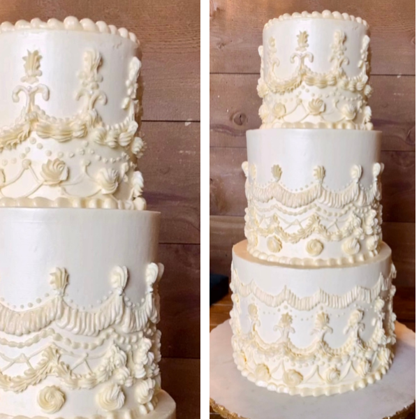 This vintage-inspired wedding cake is a true showstopper, featuring three tall tiers adorned with intricate piped detailing reminiscent of a classic, Lambeth-style design. The soft ivory buttercream is richly decorated with ornate swags, scallops, florals, and pearls, creating a sense of timeless elegance. Each tier is wrapped in delicate piping work that adds depth and texture while maintaining a graceful, monochromatic look. Perfect for couples who love a nod to the past with a dramatic and romantic twist, this cake brings vintage charm into a modern celebration.